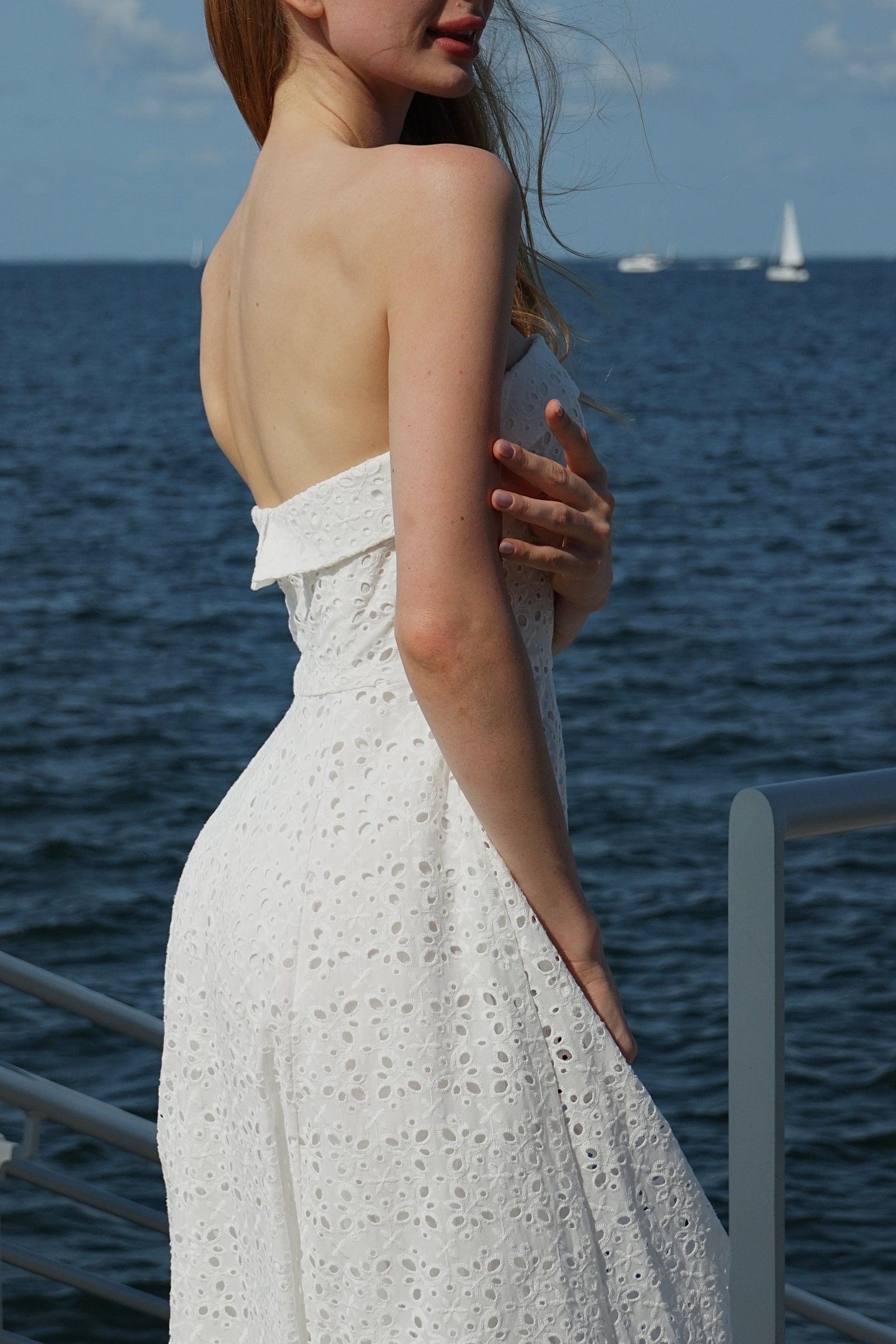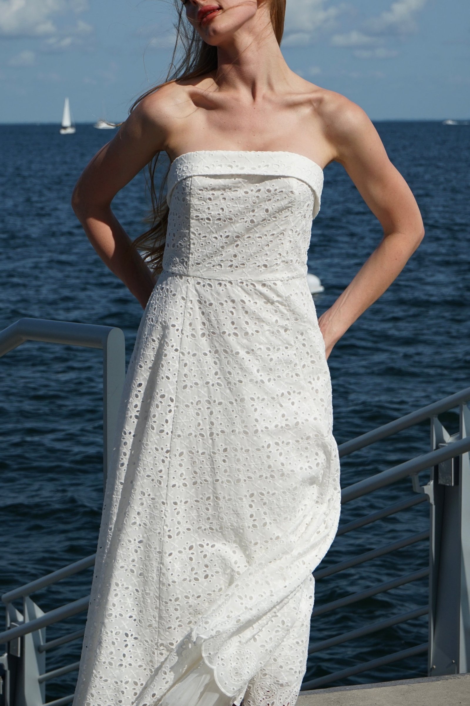 White Eyelet Strapless Midi Dress – feminine, lightweight, and perfect for sunny days and summer nights. A breezy silhouette with a soft, breathable feel.