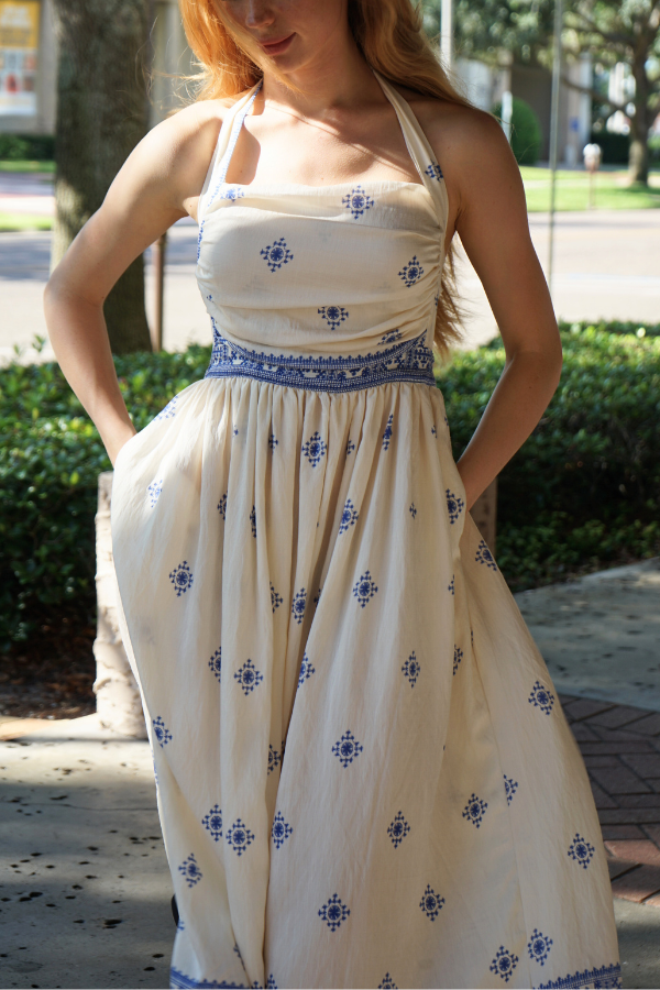 Ibiza Dress – Sun-drenched elegance with a Mediterranean soul. This halter maxi features intricate blue embroidery on a soft cream base, with a flattering smocked waist and flared skirt that sways with every step. The perfect dress for summer markets, seaside dinners, and feeling like you're on vacation
