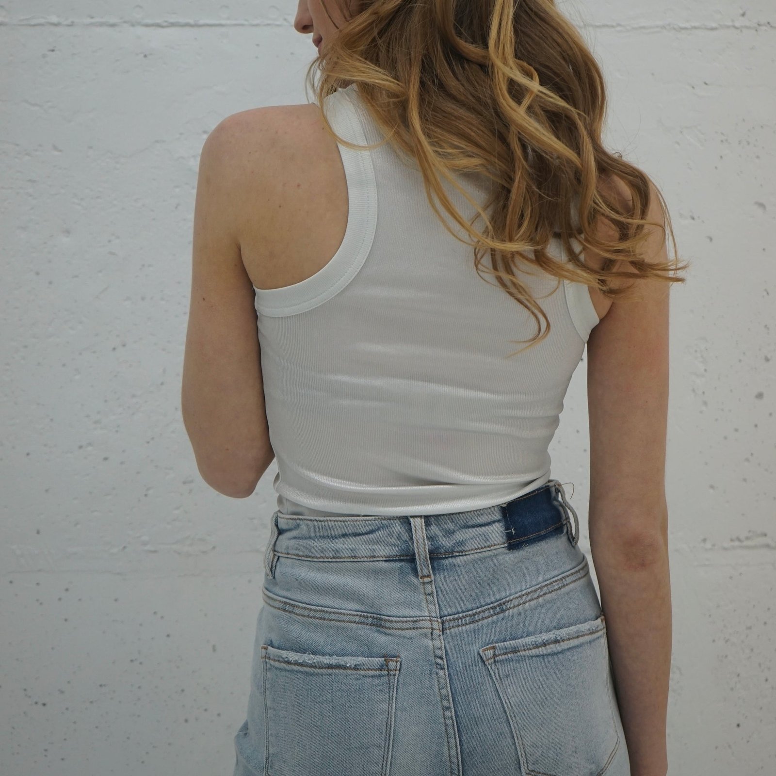Shine bright in the Metallic Formfitting Tank — a curve-hugging silhouette with a luminous finish, perfect for nights out or standout layering.