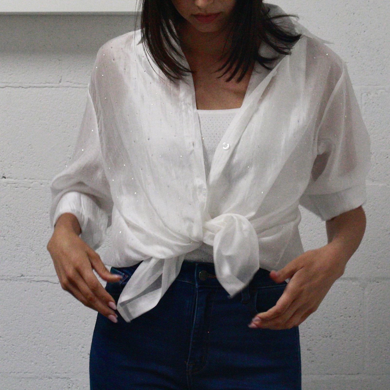 This Rhinestone White Top adds a touch of sparkle with its dazzling details, featuring a flattering fit in a versatile one-size design.