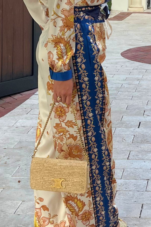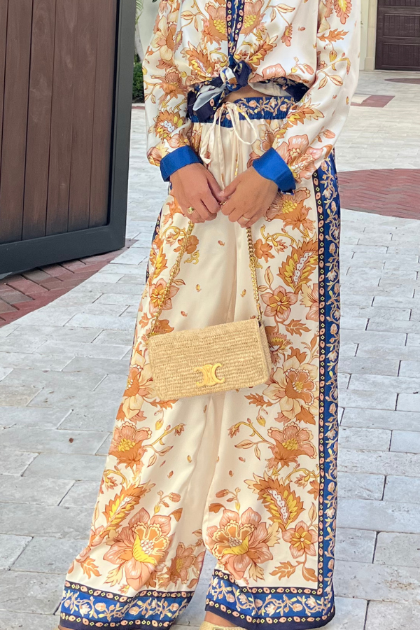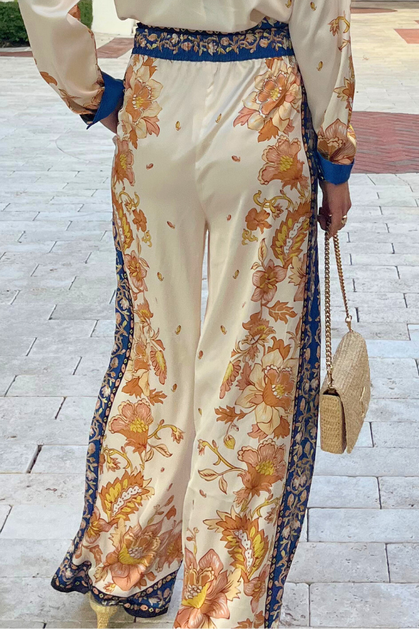 Sunset Luxe Pants – Flowing wide-leg trousers in radiant sunset tones, adorned with bold floral prints and contrast borders. Designed with an elastic drawstring waist for comfort and a silky drape for effortless elegance, they’re perfect for pairing with the matching button-up or styling solo for a statement look.