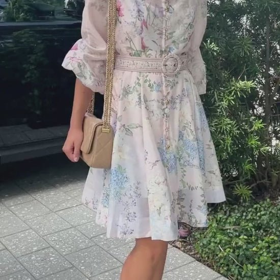 The Eden Belle Dress – A vision of romance and grace, this dress features a soft floral print in pastel tones, statement jeweled buttons, and a belted waist that flatters the silhouette. With its flowing skirt and subtle shimmer, it’s perfect for elegant daytime events, garden soirées, or any moment that calls for timeless charm.