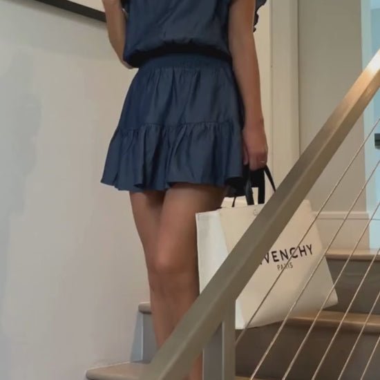 Valentina Rue Dress – Effortlessly chic in deep indigo, this dress features playful ruffle sleeves, a flattering smocked waist, and a tiered mini skirt that moves with you. Perfect for day-to-night styling, it’s the kind of piece that makes looking polished feel completely effortless.